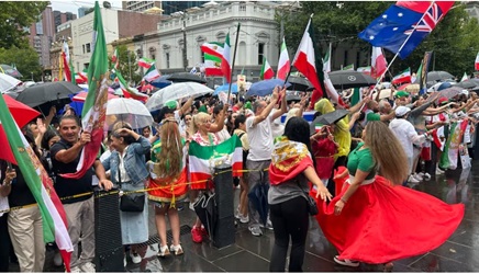 في تجمع حاشد أمام مبنى البرلمان في ملبورن، لم يثنِ المطر الغزير الجالية الإيرانية في المدينة، التي غمرتها الفرحة بنبأ وفاة آية الله علي خامنئي يوم الأحد.
